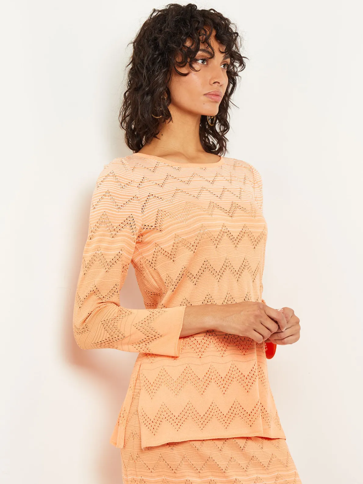Our Soft Knit Pointelle Tunic is a refreshing staple for styling an effortless resort or weekend ensemble. This subtly textured knit is beautifully adorned with a geometric print and an ombre effect of soft tones. Its fits to flatter with a feminine feel, complete with a graceful scoop neck collar and small side slits. Whether tucked in or worn out, this lovely tunic can be paired with our matching Midi Skirt or the bottom of choice to suit an elegant leisure look.