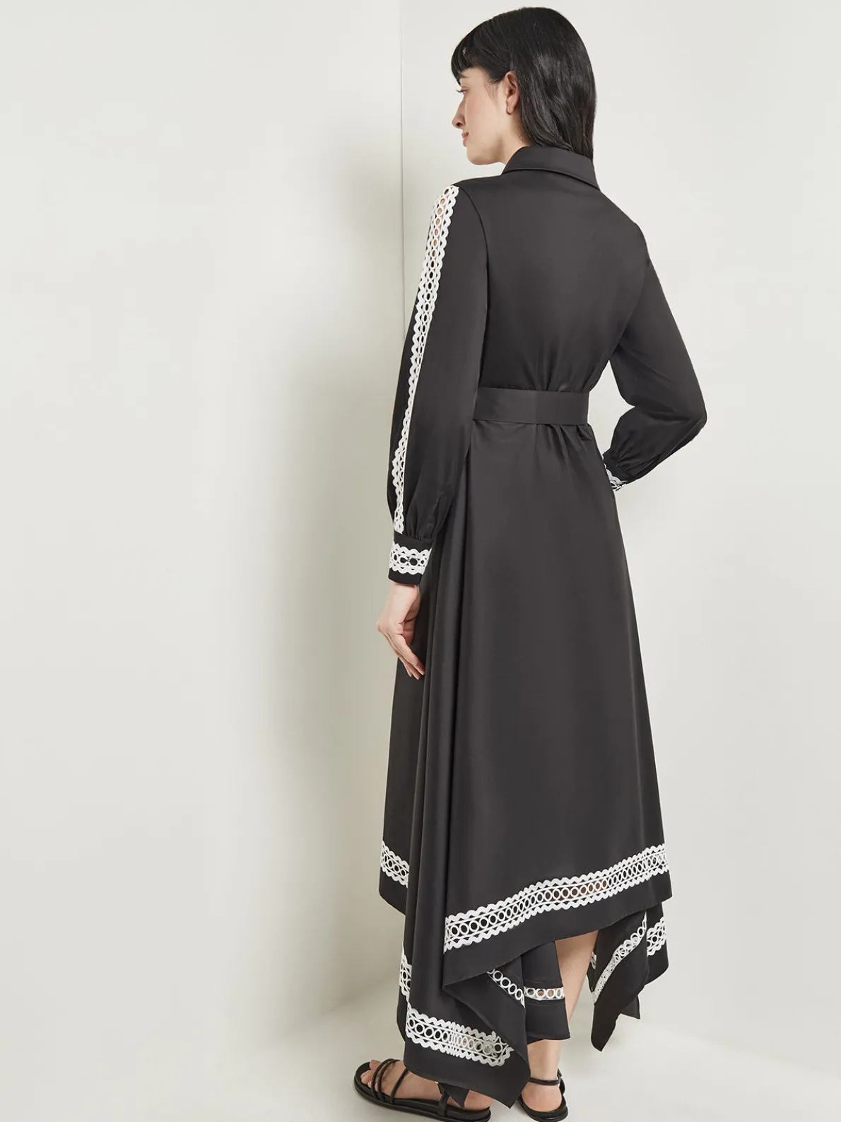 The allure of eyelet takes on a new form with our Maxi High-Low Dress, adorned with a contrasting trim that adds charm to the look. The fit & flare silhouette can be further defined with a removable tie-waist detail, while the button front closure allows for adaptable depth of the shirt collar neckline.