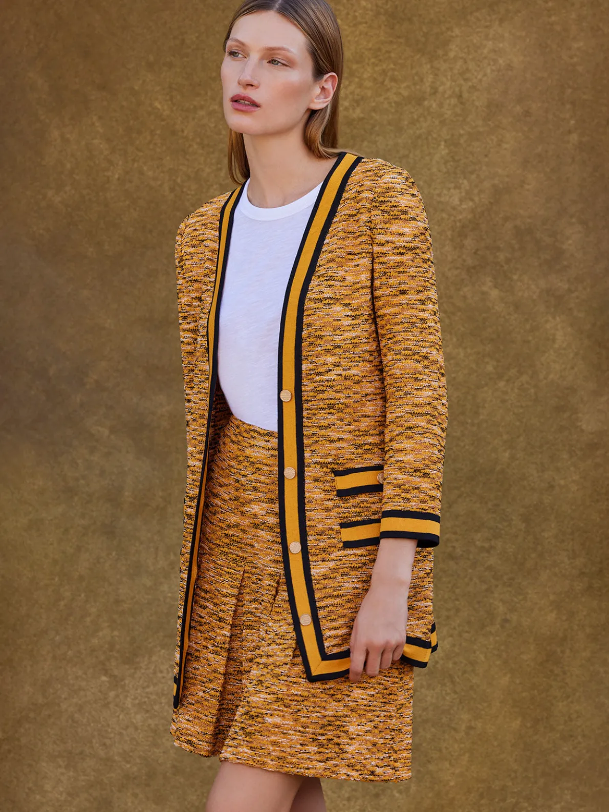 Our Mini A-Line Skirt is designed with our classic tweed knit in a bold Ochre color. This mini skirt features a drop-yoke waistline with all-over pleats that offer subtle movement. The elastic no-roll waistband and pull-on design make this garment an easy and functional piece to add to your wardrobe. Pair back with the matching jacket for a complete look.