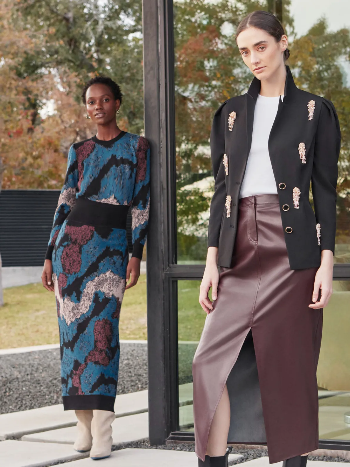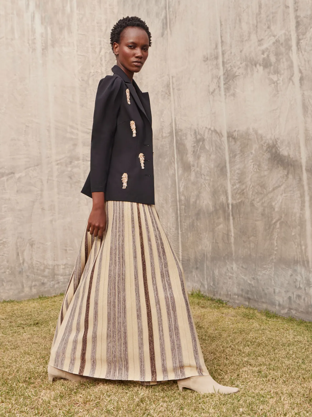 Our Beaded Applique Blazer is a beautiful conversation garment. These beads are handsewn onto the jacket, making this piece a work of art. Accompanied with a unique sleeve and a back vent at the hem for comfortability, dress this blazer up for the perfect statement piece for any special occasion.