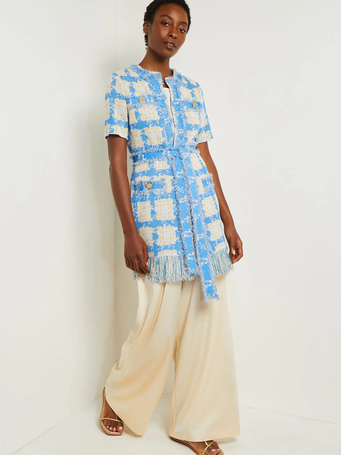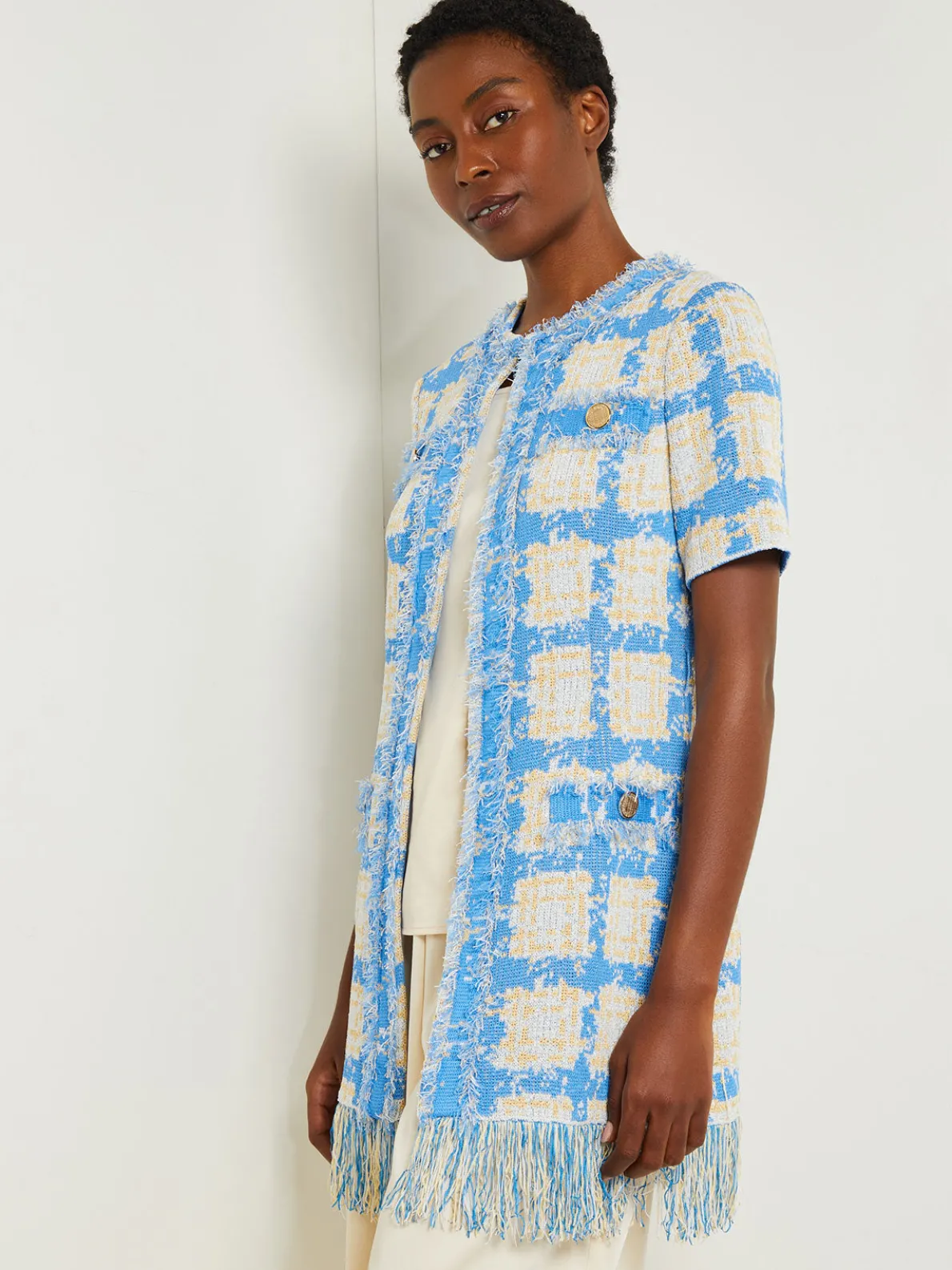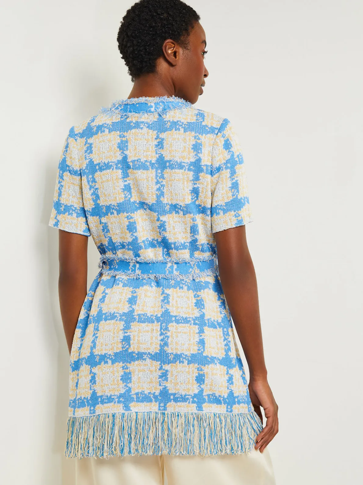 Warm weather layers have never looked as good as our Tailored Windowpane Tweed Knit Jacket. This short-sleeved jacket is stitched in a lightweight blend of yarns, with the option to utilize the hook-and-eye closure at the neck or the removable tie waist detail to close the look. Functional pockets enhance the utility, while the jewel neck collar pays homage to a more classic look.