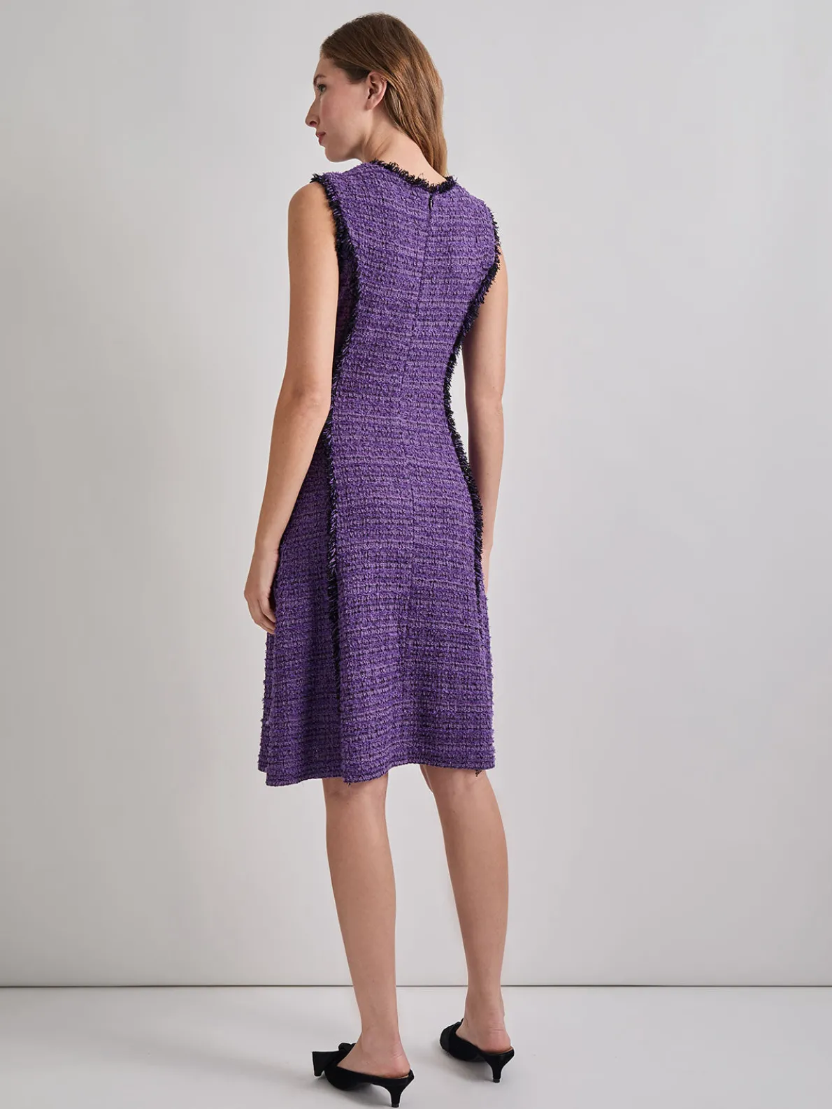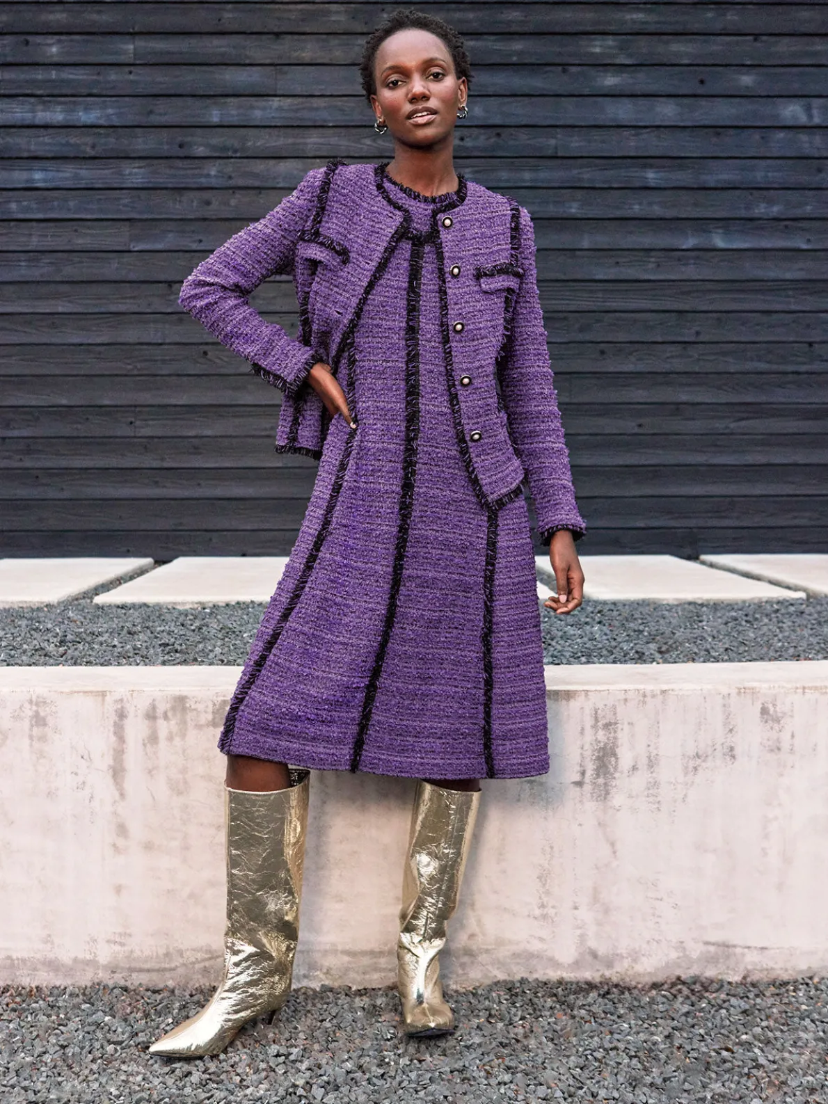 Our A-Line Princess Seam Knit Dress is the pop of color your closet needs. In our beautiful Plum Royale color, this dress features princess seams in the front and back of the garment. The eyelash trim is carried throughout the piece. Pair back with the matching jacket or wear by itself for a simple, yet effective, outfit.