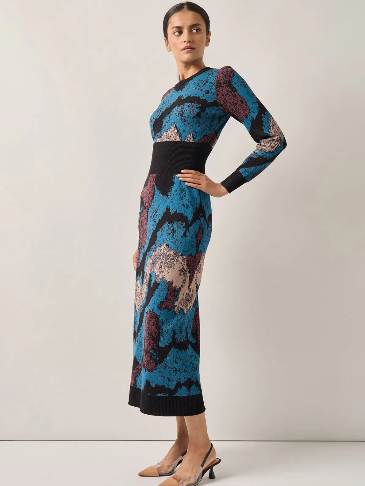 Our Abstract Sheath Knit Maxi Dress makes a statement. With its sleek sheath silhouette and pullover design, this dress is sure to please anyone who wears it. The jacquard knit is cozy, making this an ideal garment to have for the cooler months.