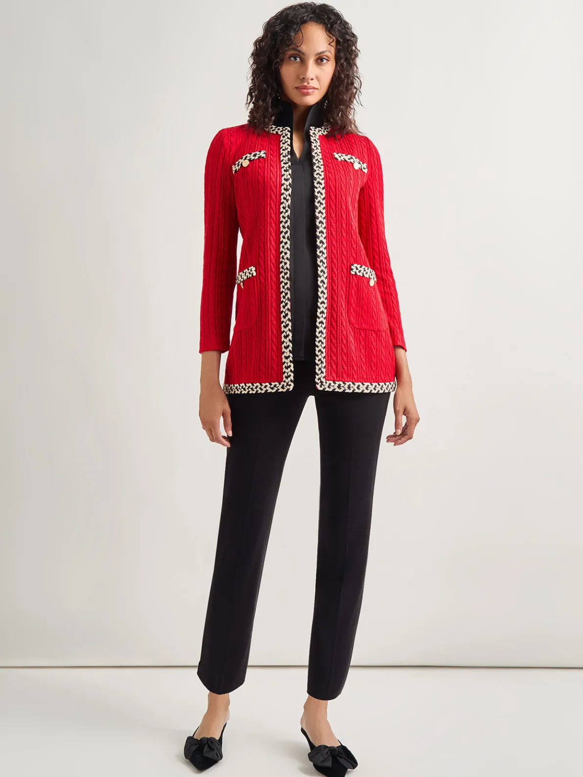 Traditional meets modern in the fascinating design of our Jewel Neck Contrast Trim Cable Knit Jacket. The classic tweed knit is enhanced with a rich color combination with braided trim along the collar, an open front, and pockets – both faux and functional. This sleek jacket flatters with a timeless heritage fit that offers a polished, tailored look. Pair it with matching tweed bottoms or sharp suiting separates for work or formal affairs.