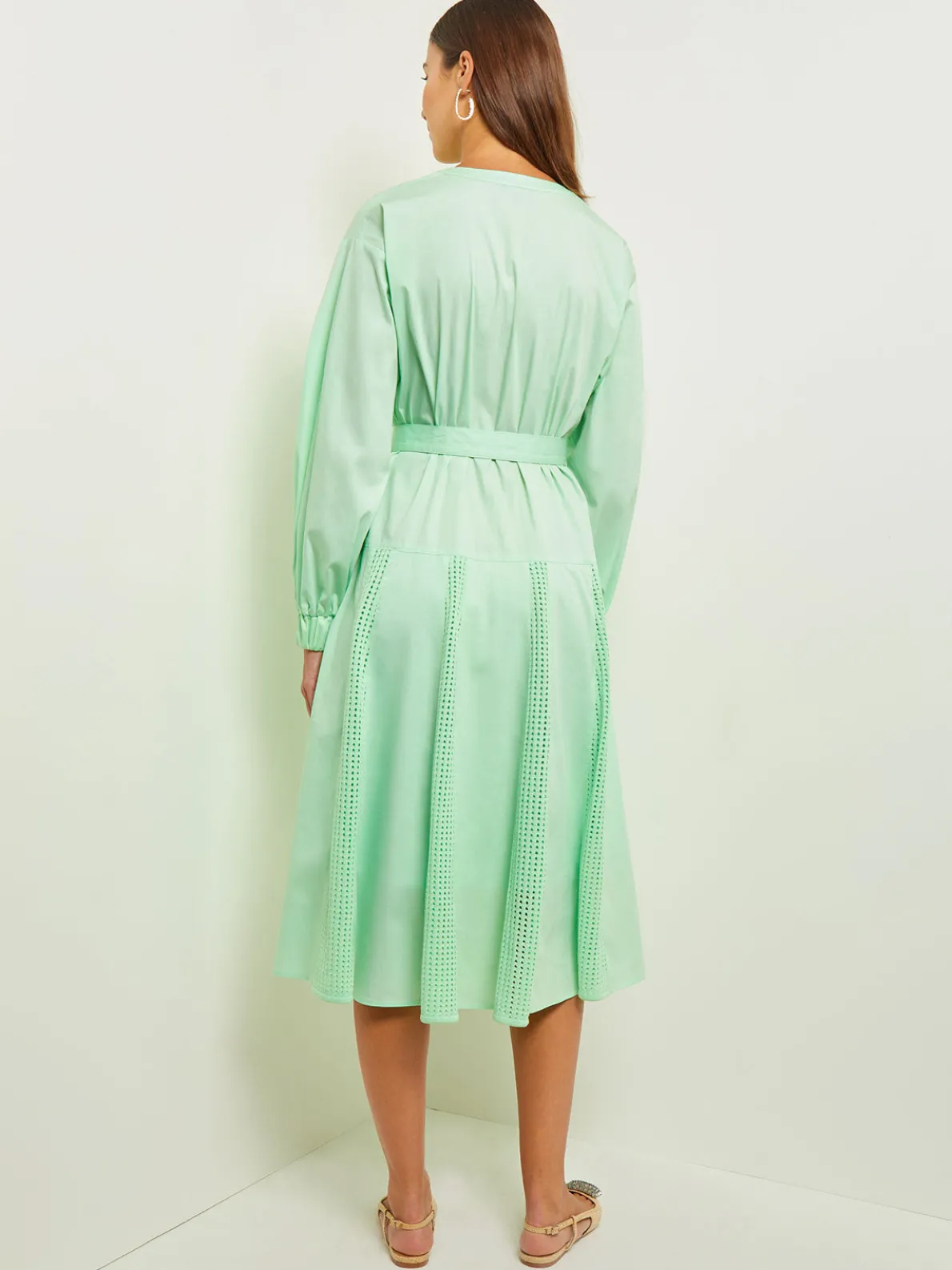 Enjoy a mix of modern details with the occasion-ready design of our Midi Drop Waist Dress. Cuffed balloon sleeves and crisp cotton construction adorned with pointelle knit stripes on the skirt lend airiness and artistry to this stunning piece. Add the removable belt to create a form-flattering fit to this versatile button front, drop waist silhouette.