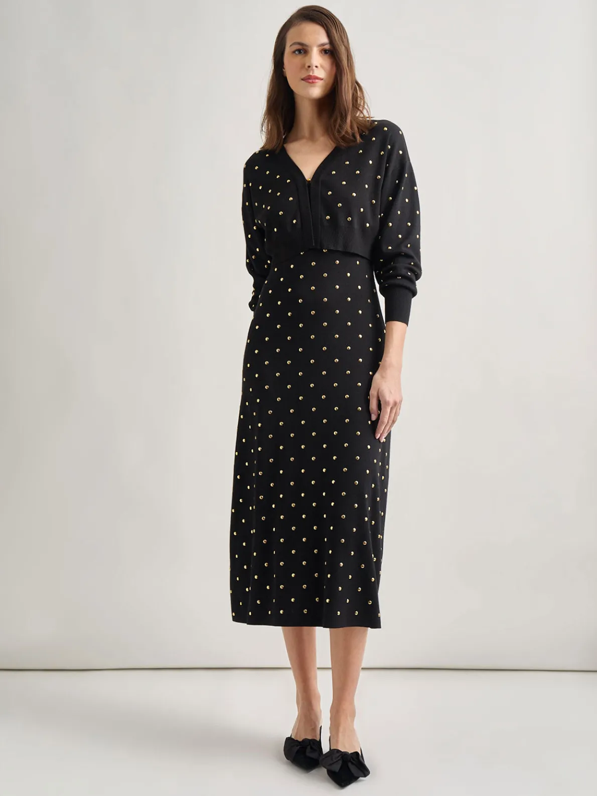 Our Cropped Gold Studded Knit Cardigan is the perfect topper for a chilly night. The gold studs make this cardigan a one-of-a-kind piece. Wear this cardigan over the matching dress for a complete look.