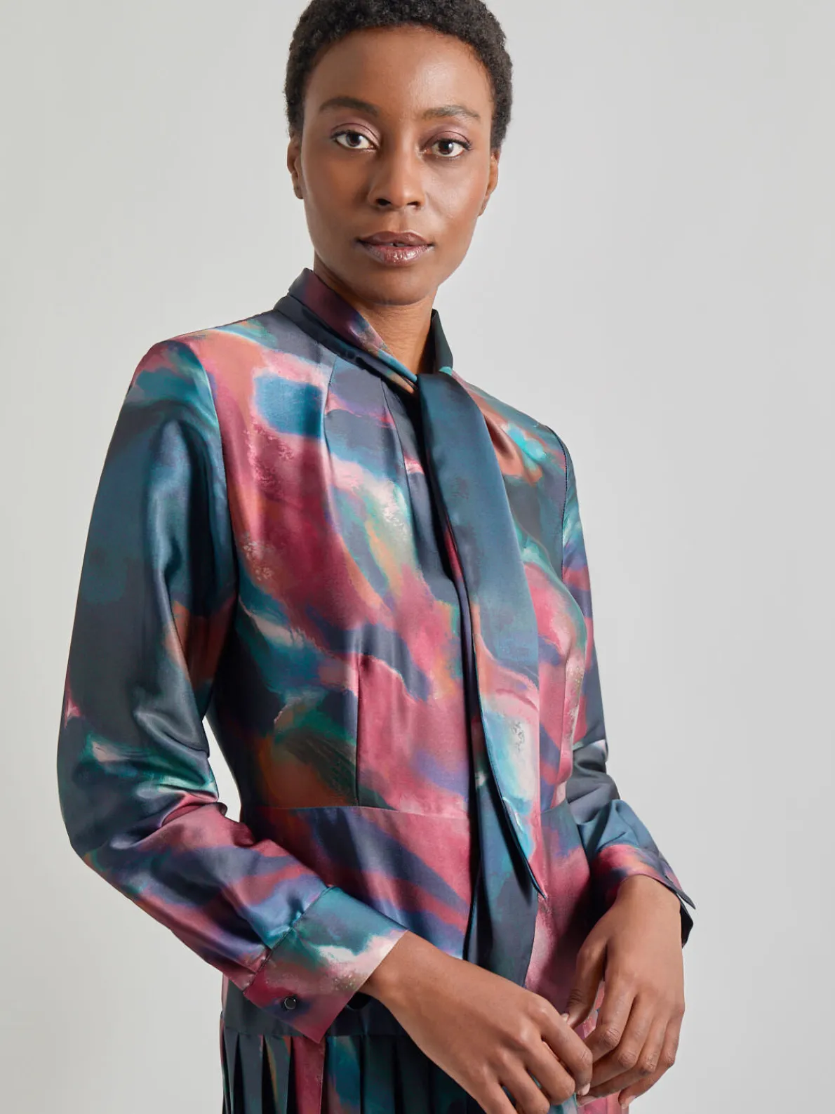 A vision of timeless elegance, our ravishing Tie Neck Pleated A-Line Maxi Dress delights with a fine combination of romantic details, including a sophisticated necktie and pleated drop-waist A-line silhouette. Sumptuous Crepe de Chine makes for a graceful, flowy fit that pulls on with ease and wears with remarkable comfort. This occasion-ready dress is available in two rich color options – equally brilliant hues for an outstanding look.